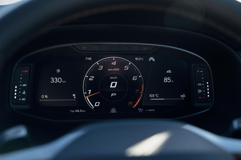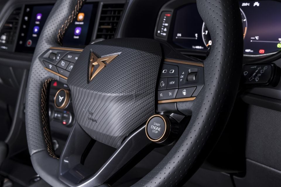 It’s finished in leather, which is perforated at nine and three o’clock. Tying it all together are Cupra’s signature bronze accents, as well as some of the same glossy metallic grey plastic seen elsewhere in the cabin.