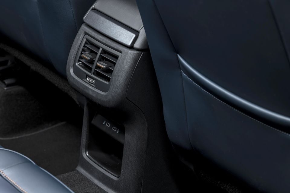On the floor is a driveline tunnel that badly eats into middle-seat legroom, and so this spot will likely only suit short drives or smaller passengers. There are at least dual air vents and USB-C ports on the back of the centre console, along with a strange storage cubby below.