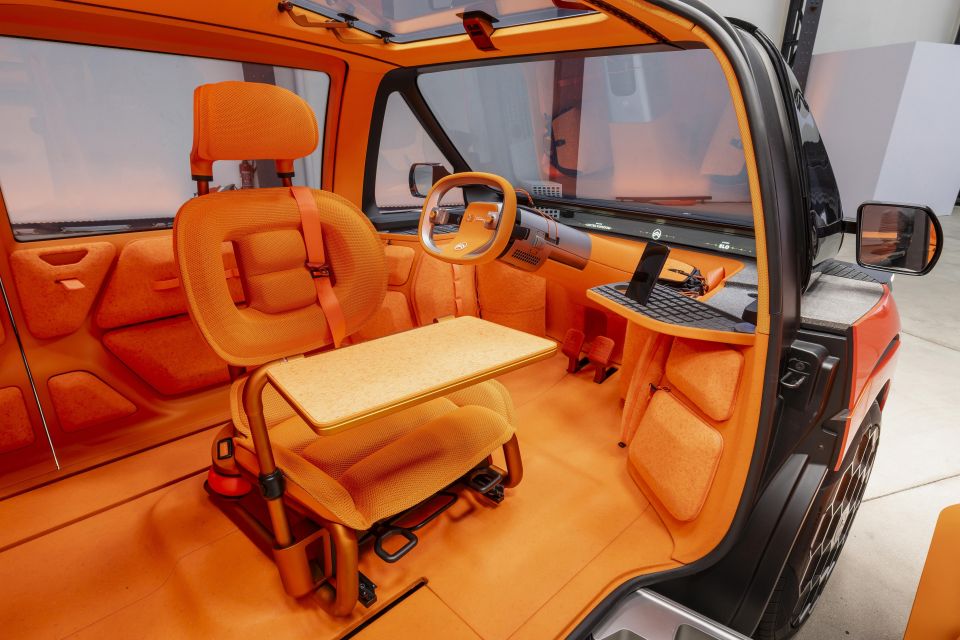 A desk attachment allows the car to function as a mobile office, and the driver’s seat can be rotated around to face the rear passengers.