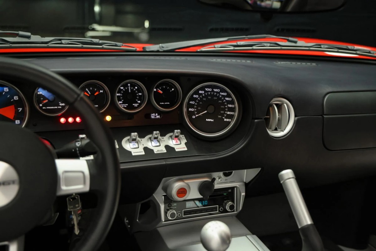 Inside, the cabin remains classic Ford GT: Ebony leather, bare aluminum floors, Sparco-built bucket seats with GT40-style grommets, toggle switches, and a McIntosh CD stereo. The instrument cluster includes a central 6,500-rpm tach and offset 220-mph speedo.