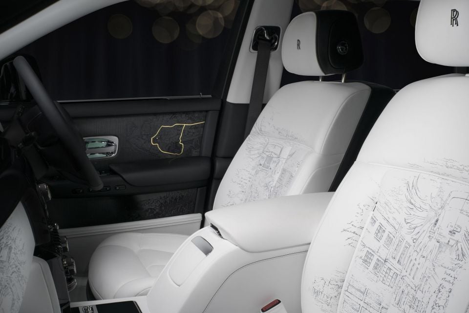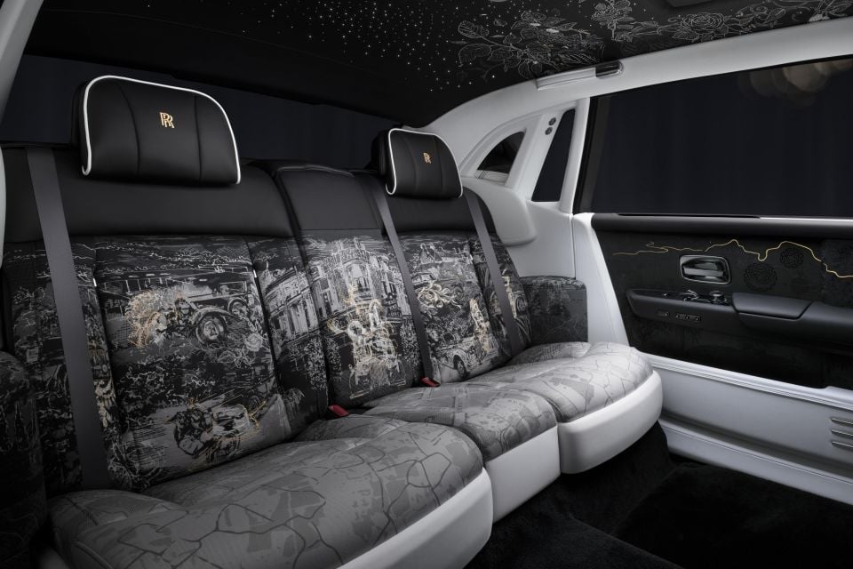 The rear seat is adorned with a printed and embroidered fabric that took 12 months to develop, includes over 160,000 stitches, and features 45 panels depicting the Phantom’s history and abstract details about owners of each generation of the car.